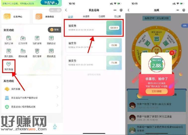 微信进入小程序“民生运动”->进入“我的-我的权益-抽奖券”有3次机会抽2.88~8.88亓立减金或实物