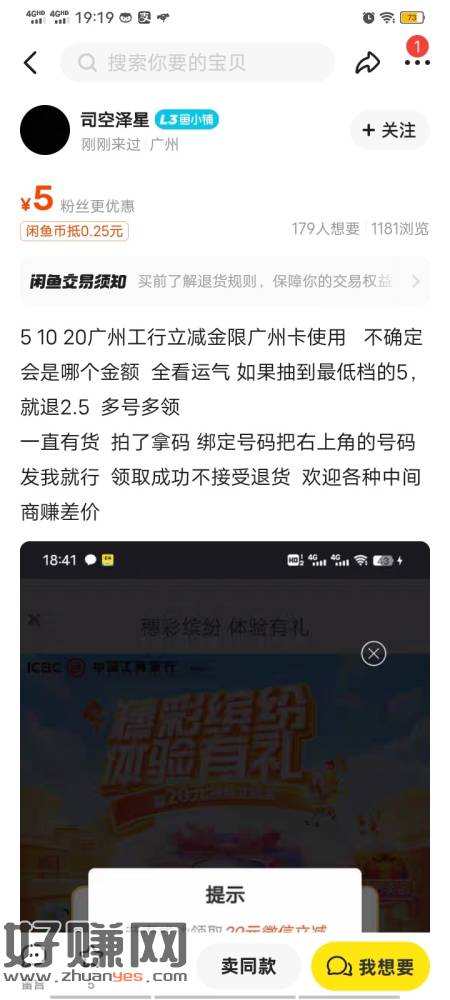 各位,晚上好!有广州工行一类或者二类的可以薅。多v多薅。1个