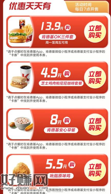 每天7点,建行生活可以买KFC肯德基早餐券,4.9