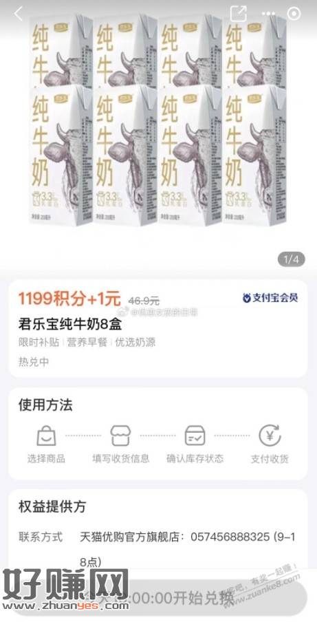 10点1199支付宝积分+1元兑换君乐宝纯牛奶8盒