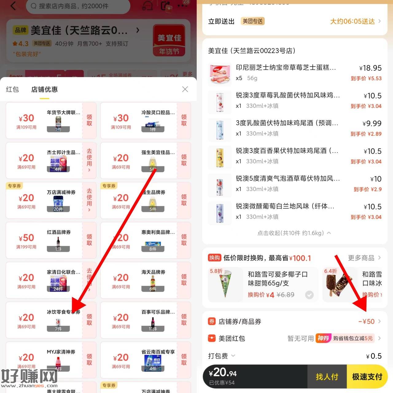 美团app搜索【美宜佳】领69-30券,这个券是全店通用券,然后领商品专区的20券,自己买哪个专区就领哪个专区的20券比如我领的是冰冷饮食20券,然后在这个专区选69元商品,可以配合减30券和20券一起用,这样就是69-5069-30人人都有 然后叠加一个商品卷叠加个20的商品卷 一起用那个美团卷-5的都可以买一下然后69-30目前可以无限领取领了可以换店一直买