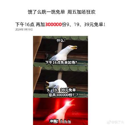 【跳一跳#饿了么免单# 16点加场】今天下午16点,跳一跳免单加场!依旧是9、19、39元免单,共计300000份同时给每位家人送上5次游戏机会!(15:00起,在任务栏直接领取)饿了么App搜「免单」16点准时见❤️