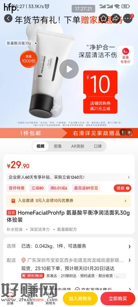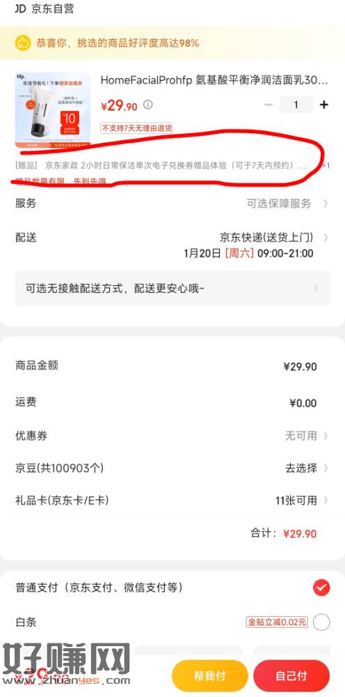 算是0元洁面乳 下单29.9元 赠送京东家政券一张 可以找京