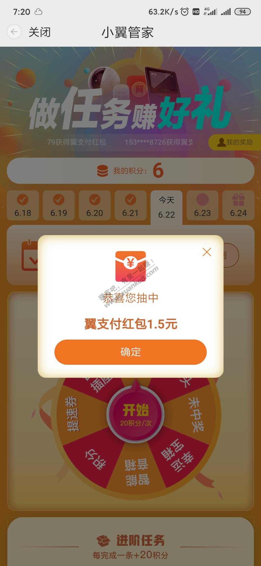 亲测20元支付宝红包 移动完成任务抽奖