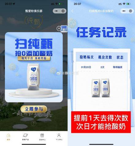 【纯甄AR扫纯甄每天抢2箱酸奶】10点准备开抢!微信进入小程序“甄爱粉俱乐部”->点击弹窗进入->提早一天扫图得2次机会,次日10点整抢2箱纯甄酸奶包邮