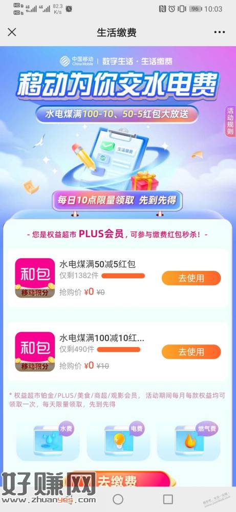 移动,和包100-10和50-5生活缴费券
