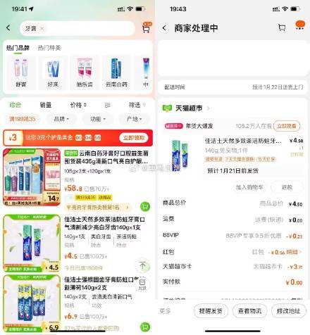 【天猫超市0~1.5亓撸佳洁士牙膏】淘宝首页“天猫超市”->搜索“牙膏”领3亓个护金->再打开地址买牙膏即可抵扣