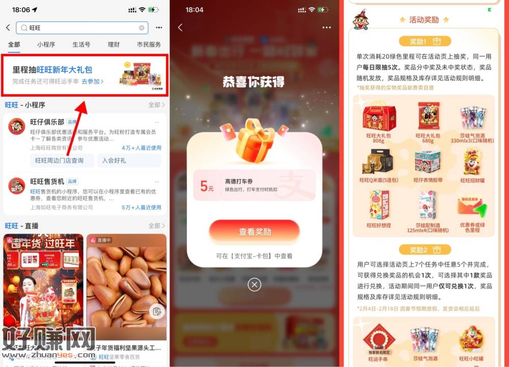 【支付宝里程抽旺旺新年大礼包】支付宝搜索“旺旺”->点击横幅进入->简单浏览得里程,每20里程抽打车券或实物等奖励(部分实物需要邮費)