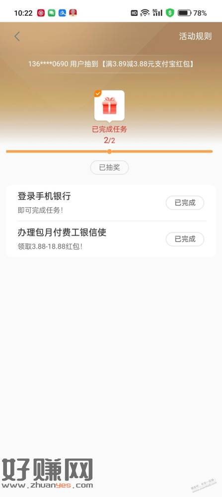 任务中心,享活动,看看有没有信使包月大礼这个活动,包月花3元,然后抽奖,最低中3.88,我刚才抽到18.88,ZFB到账可套,我是浙江的