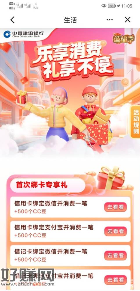 建行cc豆任务又上新了,支付宝微信绑定借记卡各消费一笔得10