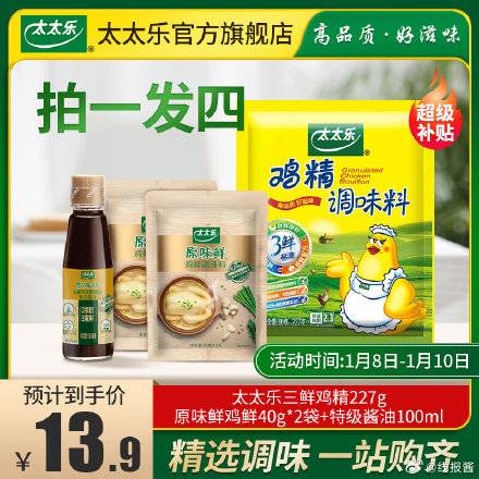 【10.9元包邮】太太乐 三鲜鸡精227g+原味鲜鸡精40g*2袋+酱油100ml