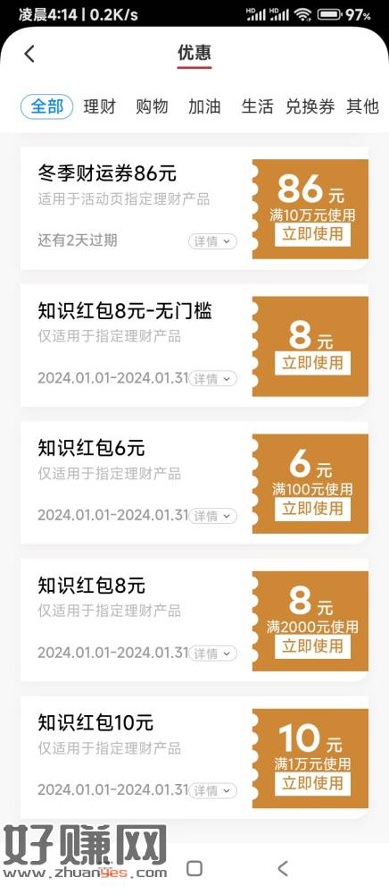 ②首页上方横幅中间,赢8888现金,购买10元理财产品,每天5次抽奖机会