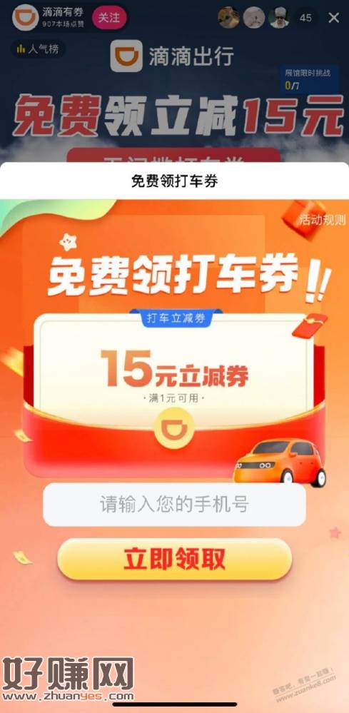 dy直播间,90天没打过车的,领15无门槛