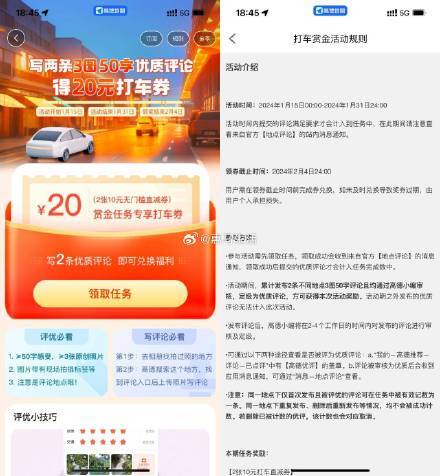 【高德打车评论领取20亓打车券】新一期!高德地图APP搜索“打车赏金”->根据要求写2条优质评论,领2张10亓无门槛打车立减券