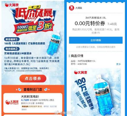 高德搜索大润发,进任意门店中间横幅可以领取3M玻璃水1.5L