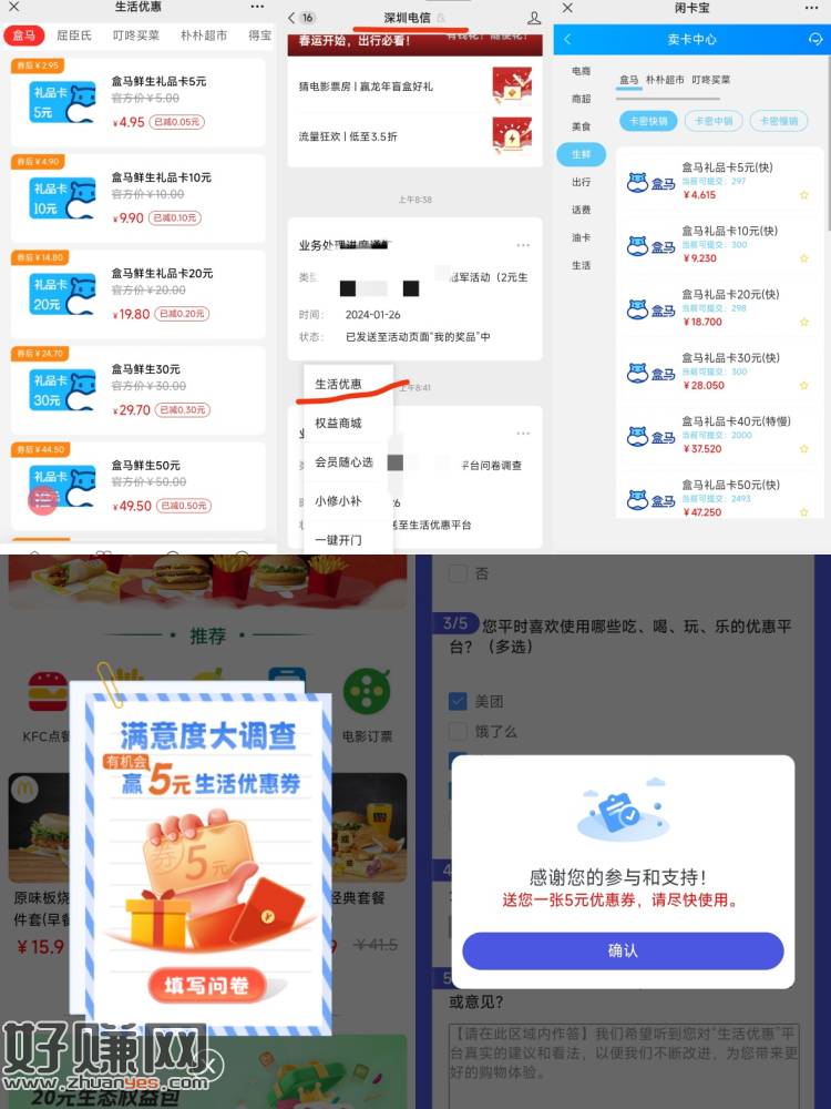 楼下的深圳电信抽奖 抽到2r生活券的 点生活优惠 进去买5盒马 然后卖闲卡宝 润1.66 点进去还能答问卷 运气好还能拿5