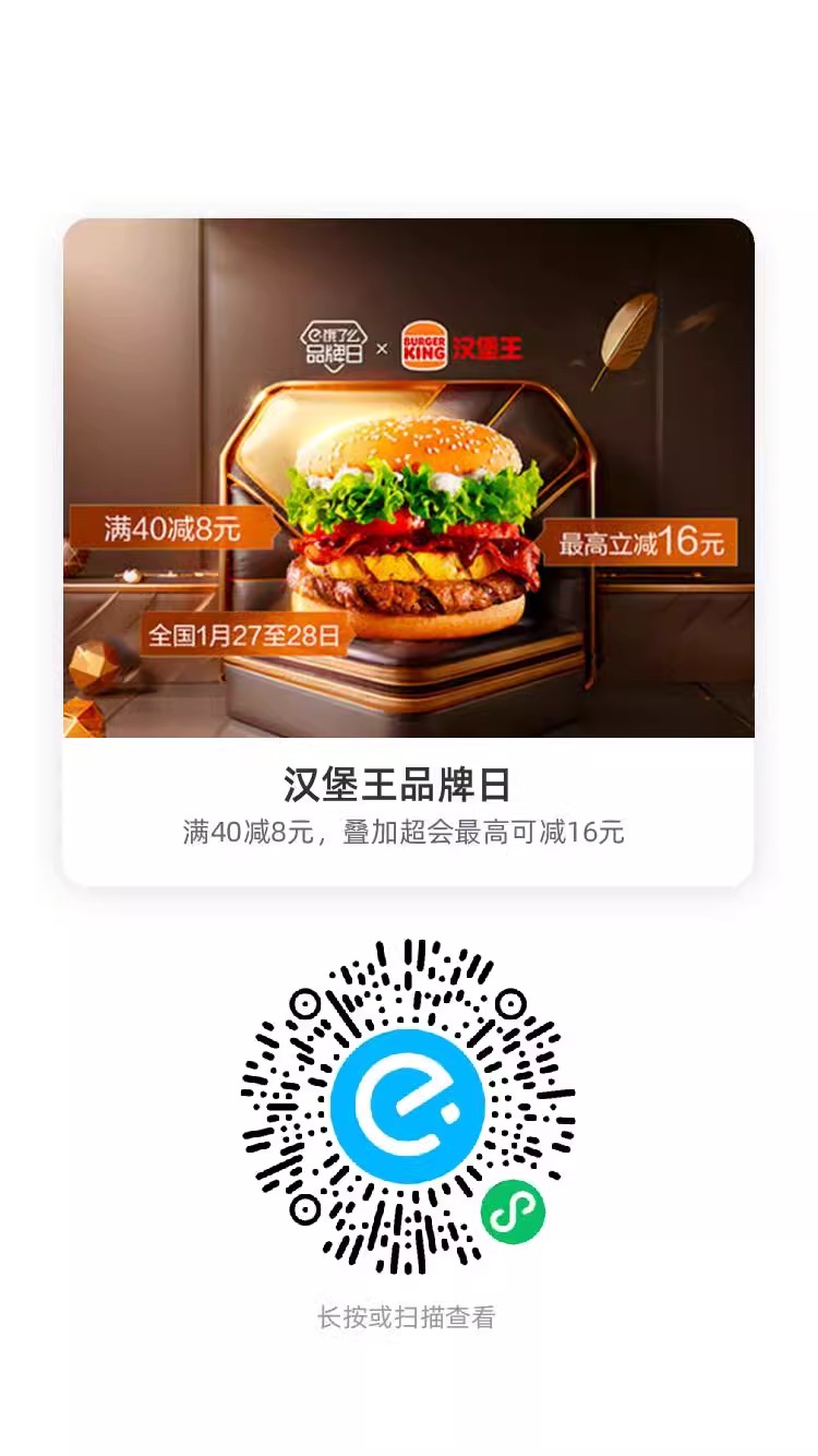 饿了么汉堡王今天有40-8叠加会员可以40-16,按需微信扫看看