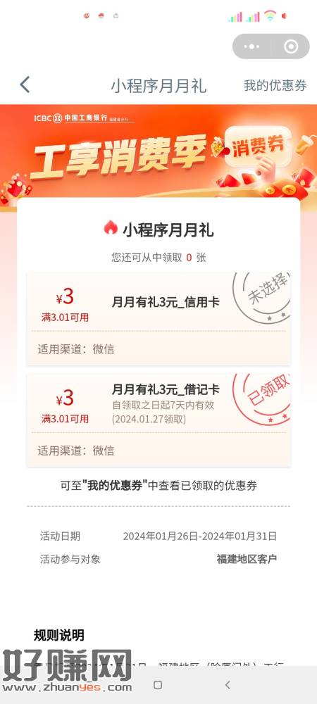 工行福建公众号,里面点工行服务,然后进去找到工行消费季,必中3微信立减金,福建工行都有