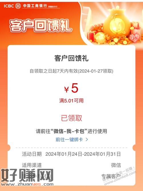 登录中国工商银行手机银行APP,在首页搜索栏搜索“工行消费季”进入活动页面,可参与“客户回馈礼”活动,有机会领取5元借记卡微信立减金,微信绑定工行借记卡即可使用。活动仅面向特邀客户,短信转发无效,名额有限,先到先得