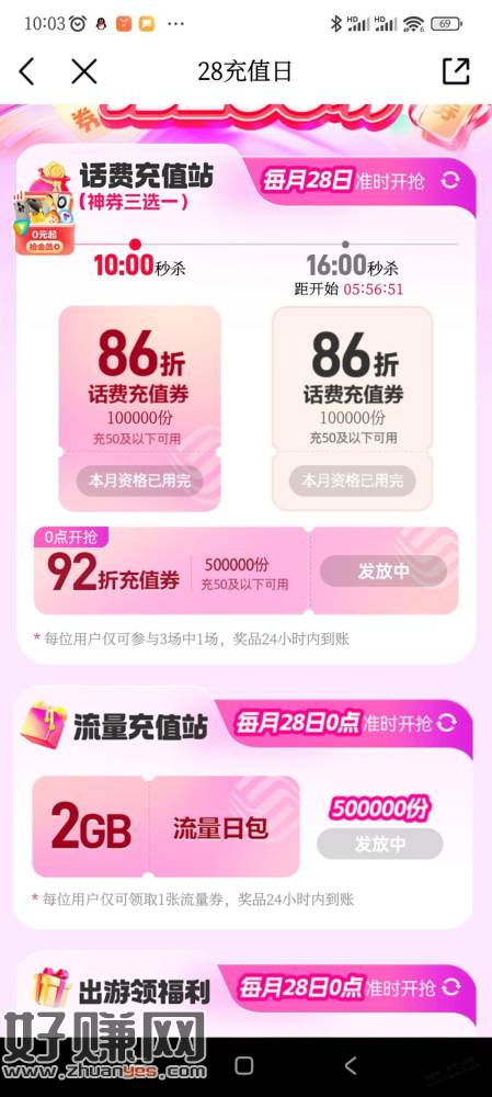 92折充值券比较多,还可以领取2G流量