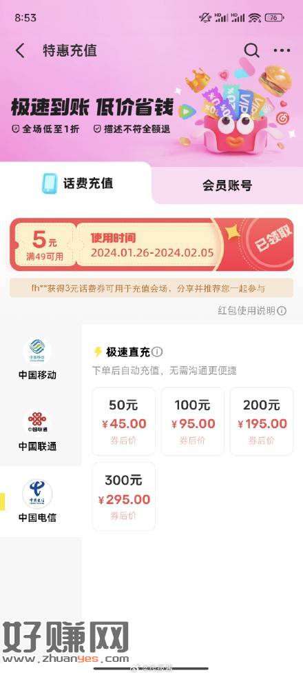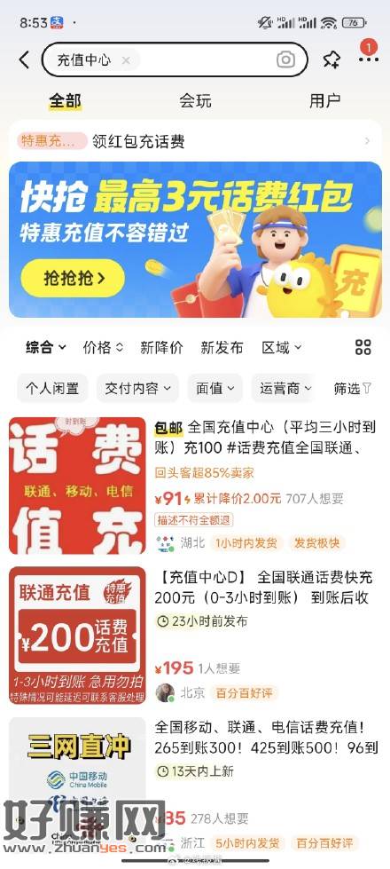 闲鱼搜充值中心,点广告进去,部分人有49-5话费券