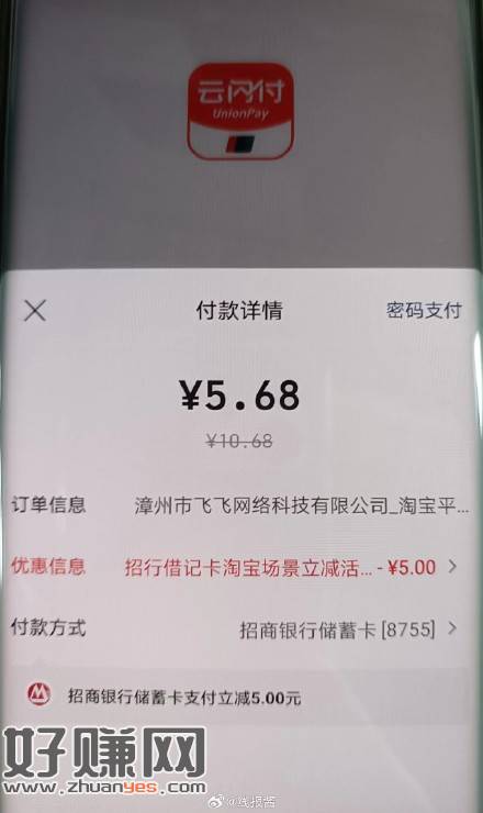淘宝买东西用云闪付 招商银行卡10-5 可以买10