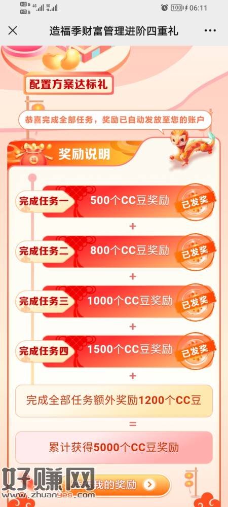 完成四个全部任务一共可以获得5000CC豆,相当于50元。任务包括:风险评估入门礼、财富体检尝鲜礼、财富规划体验礼和配置方案达标礼。去年参加过的小伙伴还可以继续参加。