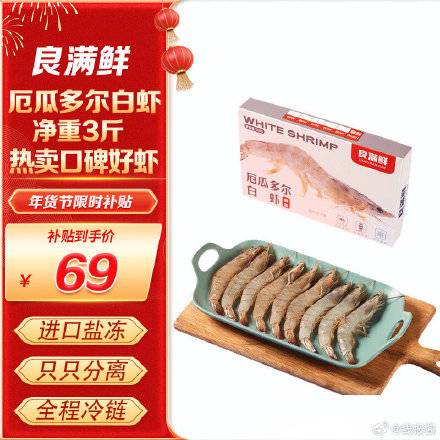 69元,良满 鲜 厄瓜多尔白虾 净重1.5kg/盒