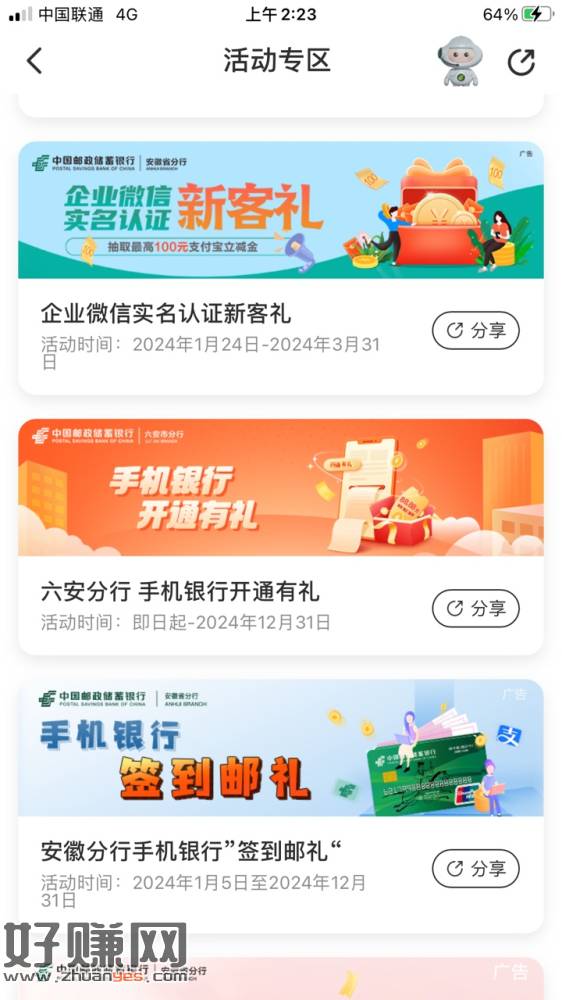 邮储六安,手机银行开通有礼,基本都是5,不限卡