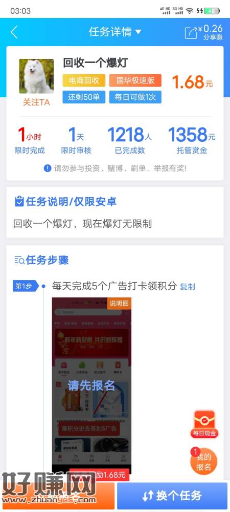 长久现金毛,国华极速版,每天五个广告领一个0.68积分然后去接单平台做任务,目前最高是1.68一个,这个还会涨,之前1块以下,可以下了囤一点