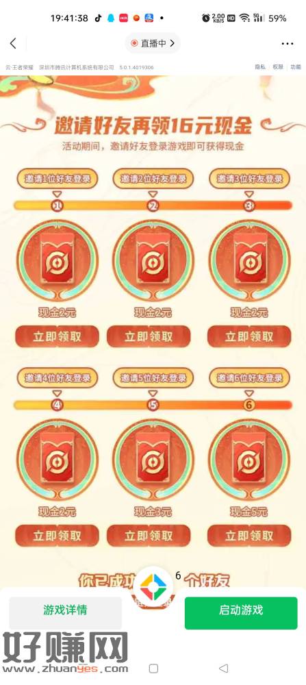 王者邀请微信号内专属好友,领现金,最多邀6个,16元。小号多