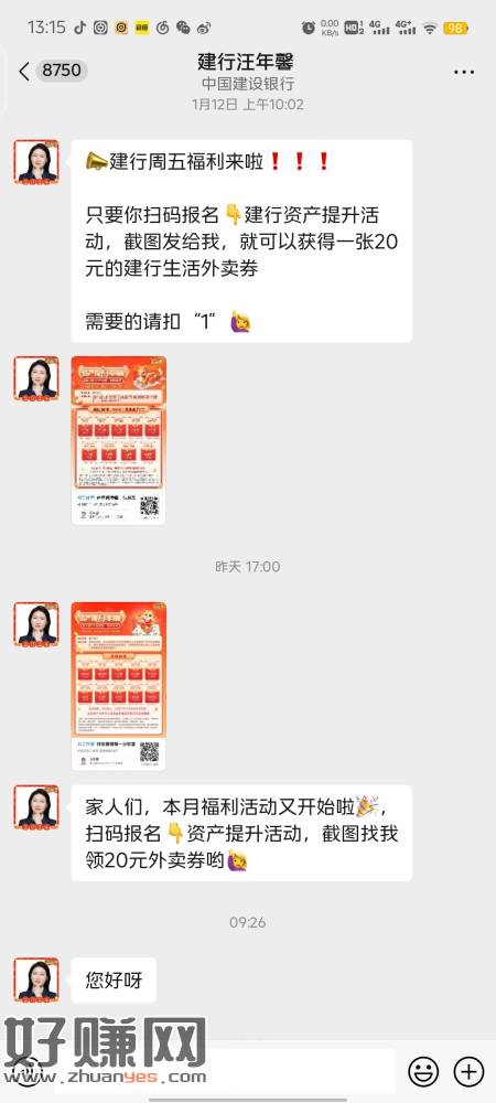【建行】看图,建行公众号左三加经理(我是网点加过好友),报名这个活动发截图领外卖券