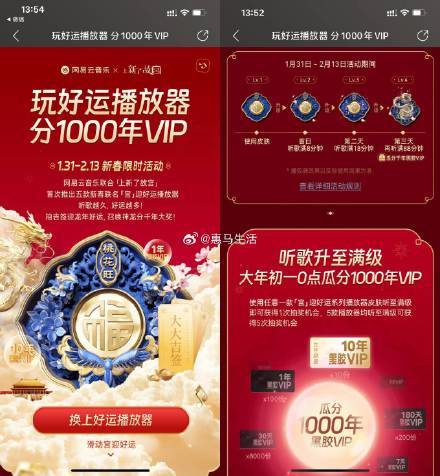【网易云音乐听歌瓜分1000年会员】打开活动地址->跳转到网易云音乐APP->设置一个播放器皮肤,然后听到满级得1次机会,5个皮肤共得5次机会->在2月10日0点瓜分1000年会员
