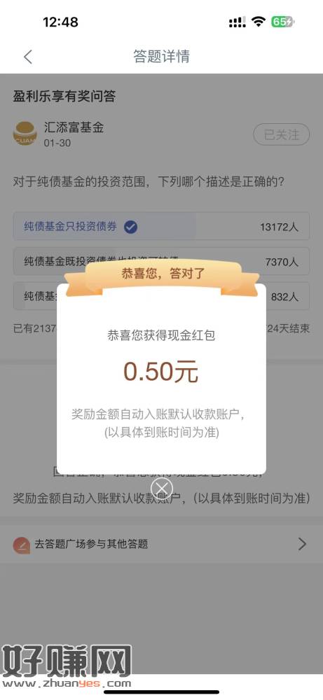 中国工商银行APP点底部【财富】再点中间滚动图【盈利乐享】进去下拉到底点答题进去,答案选第1个(答案是:纯债基金只投资债券),刚中0.5元现金