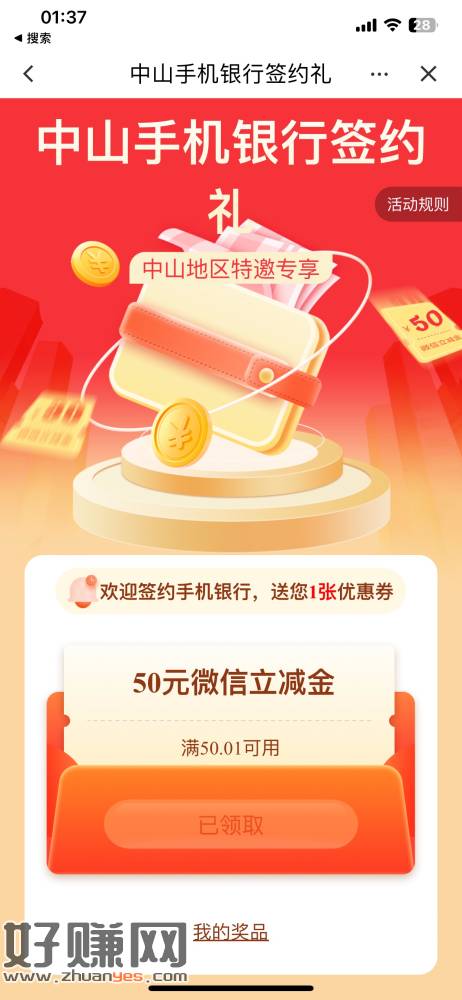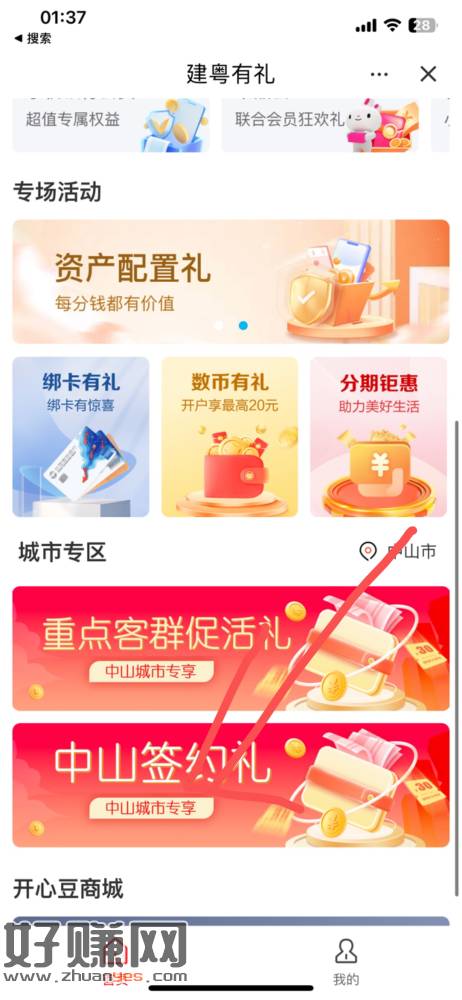 没中山卡的开个中山e账户,去年开不了的刚试了下能开了具体自测,开完zx手机银行步骤同上,最后搜索建粤有礼进去领。