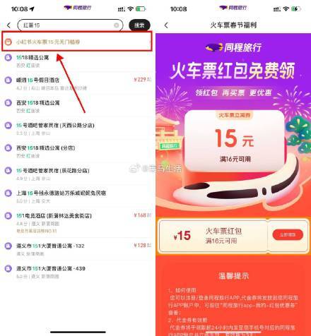 同程旅行领16减15元火车票券,去哪儿旅行聆取15亓火车票卷