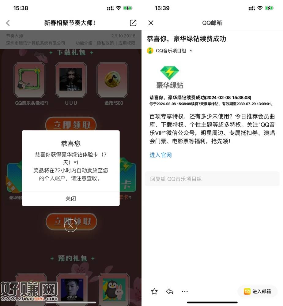 【节奏大师新用户领7~365绿钻】打开地址跳转到QQ音乐->下载登陆游戏->返回页面领7~365天绿钻(苹果有角色的好像可以直接领)