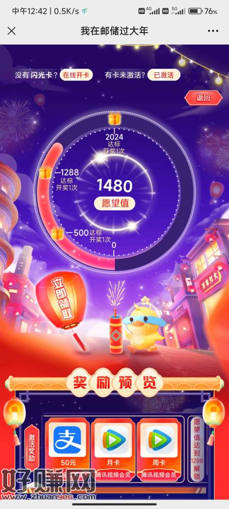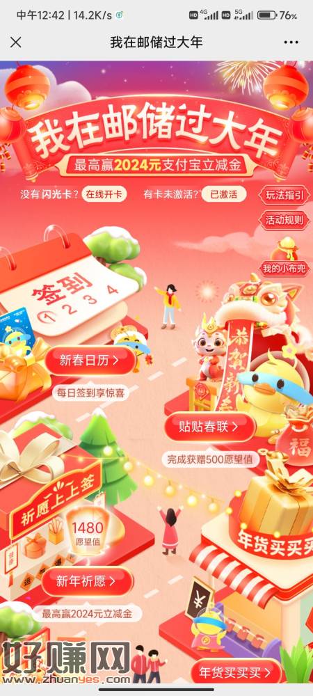 邮储联名卡,公众号,右下角,我在邮储过大年,签到,串门互,一天10次,新年祈愿,3个阶段抽奖,最后一个阶段抽2024立减金