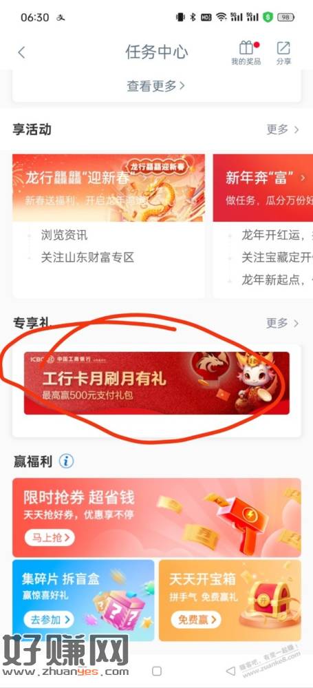 任务中心里工行月月刷抽了两张20立减金,限山东