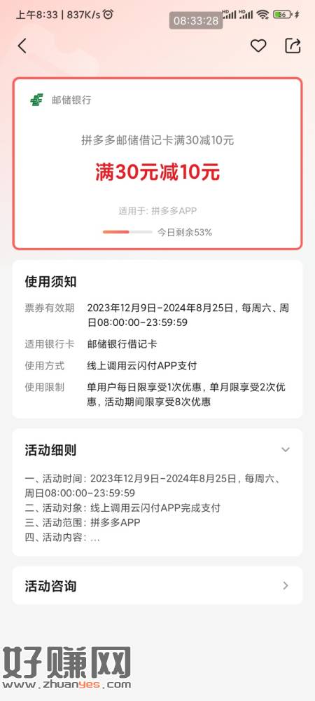 都没起来是不是 拼多多跳转云少妇邮储卡付款30-10 现在还有名额 一月2次