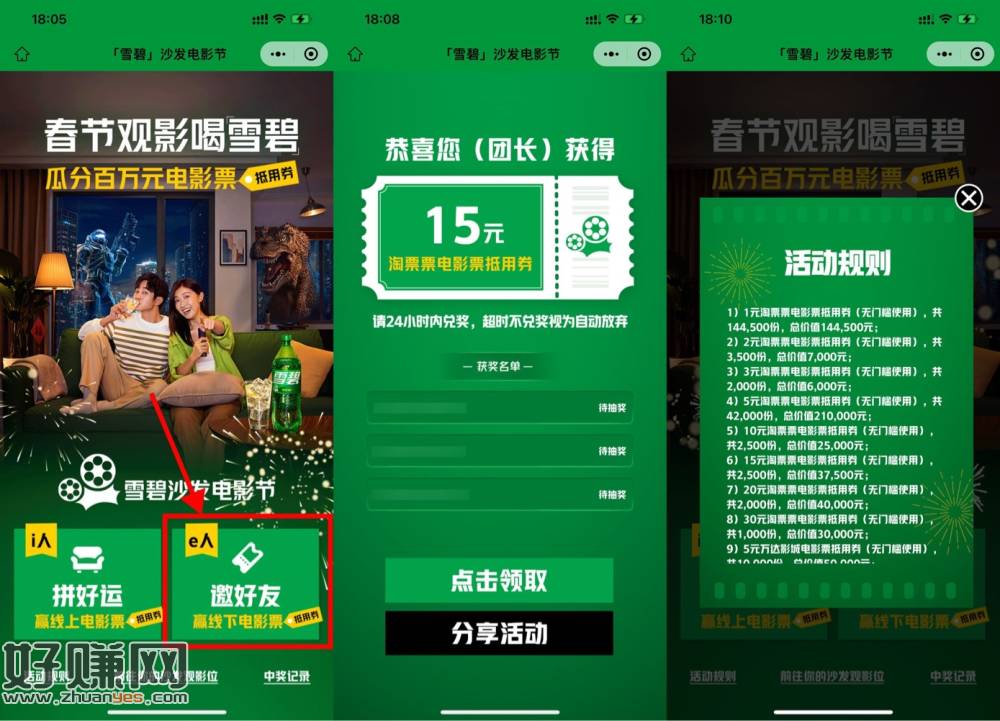 【雪碧邀3人抽1~30元淘票票券】微信打开地址->选择“e人邀好友”->邀请3人助力->直接抽1~30亓淘票票电影抵扣券