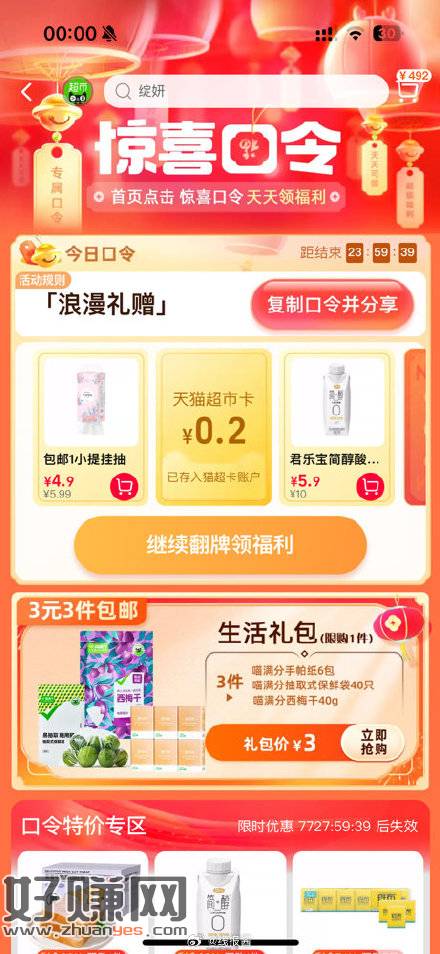 今天猫超右下惊喜口令输入[ 浪漫礼赠 ]翻牌就可领猫超