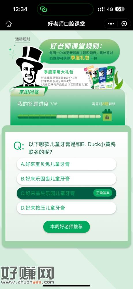 微信打开地址->每周1一道题目,连续答对15周领黑人牙膏礼包(牙膏160g*3支+牙刷4支)