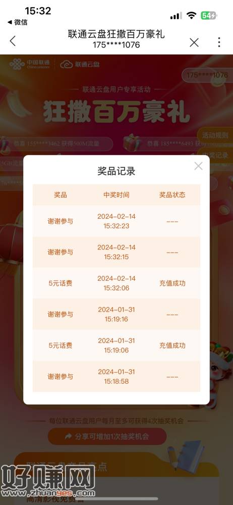 中国联通APP,搜索联通云盘,画起来的那个横幅进去直接抽3次