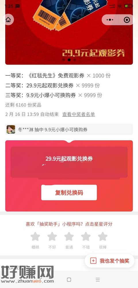 进万达企业群抽奖,29.9观影券。一天抽一次刚2中2。