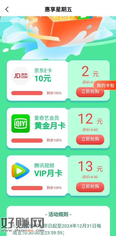 【河南农行】龙年到,鸿运照,农行送礼享不停!2元抢购10元京东E卡,优惠抢购爱奇艺、腾讯视频月卡,每周五登录农行手机APP城市专区-惠享星期五或点击(