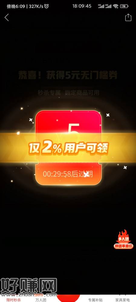 拼多多 首页 限时秒杀 进去部分人自动弹5无门槛 可0撸