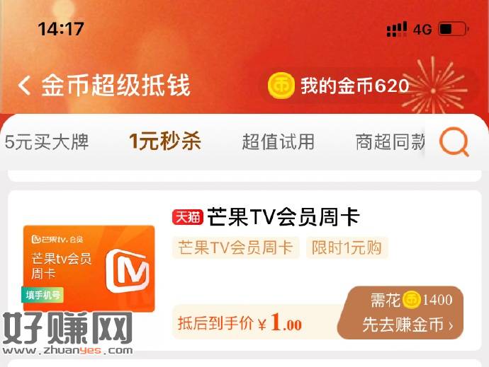 淘宝,淘金币,超级抵钱,有一元芒果TV会员周卡