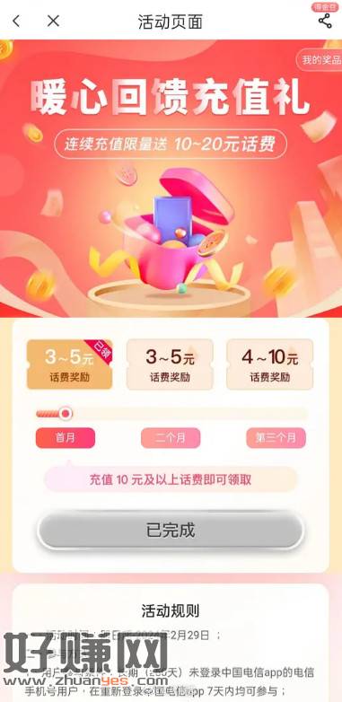 中国电信app——首页——话费账单——充值活动。