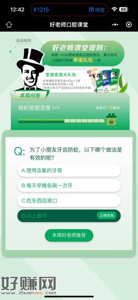 微信打开地址->每周1一道题目,连续答对15周领黑人牙膏礼包(牙膏160g*3支+牙刷4支)